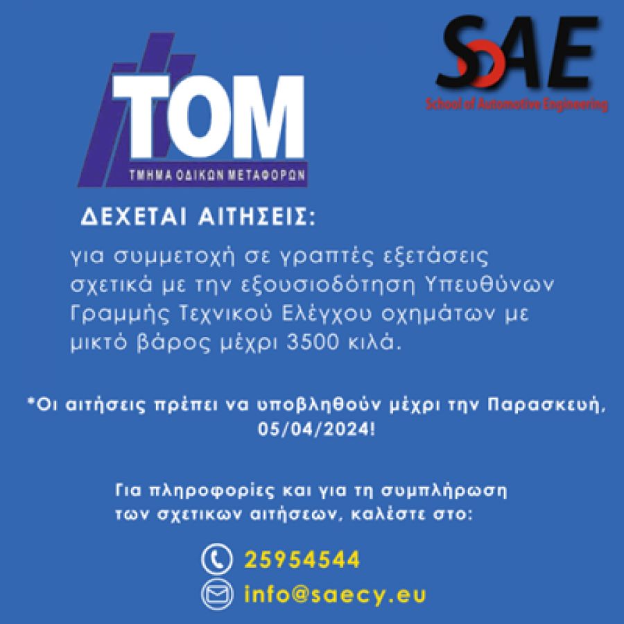 Το τμήμα Οδικών Μεταφορών του Υπουργείου Μεταφορών, Επικοινωνιών και Έργων, ανακοινώνει πως δέχεται αιτήσεις, για συμμετοχή σε γραπτές εξετάσεις σχετικά με την εξουσιοδότηση Υπευθύνων Γραμμής Τεχνικού Ελέγχου οχημάτων με μικτό βάρος μέχρι 3500 κιλά που θα διεξαχθούν την Τρίτη, 30 Απριλίου 2024!