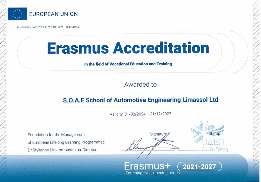 As a newly accredited Erasmus+ institution since February 1, 2024, the School of Automotive Engineering Limassol (S.o.A.E.) is excited to offer students and staff the chance to participate in Erasmus+ programs throughout the period 2024-2027.